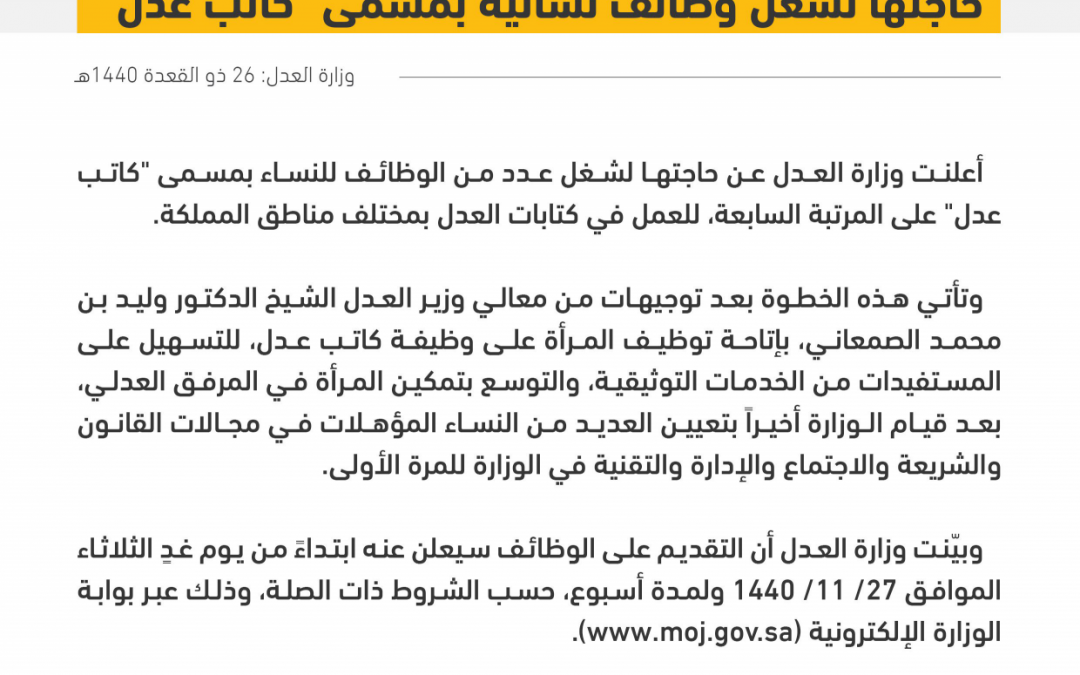 وزارة العدل تعلن وظائف نسائية بمسمى كاتب عدل في مختلف المناطق وظيفة