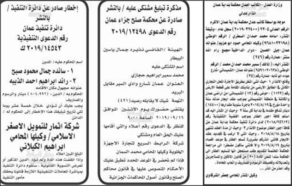 مذكرات تبليغ وأحكام وإنذارات عدلية وتنفيذ قضائي الخميس 19 9 2019 أسماء